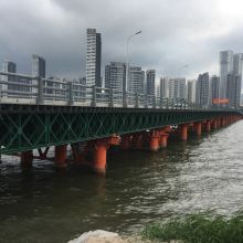我們一般比較常見(jiàn)的貝雷片的材料通常為16Mn,每片架重270kg,其中“321”鋼橋用的貝雷片鋼橋類(lèi)就是裝配式公路的鋼橋,這種裝配的公路鋼橋的最大特點(diǎn)是構(gòu)件非常的輕巧,在組裝和拆卸方面都十分的方便,所以,這類(lèi)鋼橋可以用最簡(jiǎn)單的工具和人力就能快速的建成,而且根據(jù)不同的公路特點(diǎn)和特殊情況而言,它的適應(yīng)性能也很強(qiáng)。它可以適用于汽車(chē)-10級(jí)、汽車(chē)-15級(jí)、汽車(chē)-20級(jí)、履帶-50級(jí)以及掛車(chē)-80級(jí)等等這5種載荷,可謂適用性方面也非常的廣泛,可以完成在橋梁施工中起吊移運(yùn)預(yù)制構(gòu)件等現(xiàn)場(chǎng)施工作業(yè)。